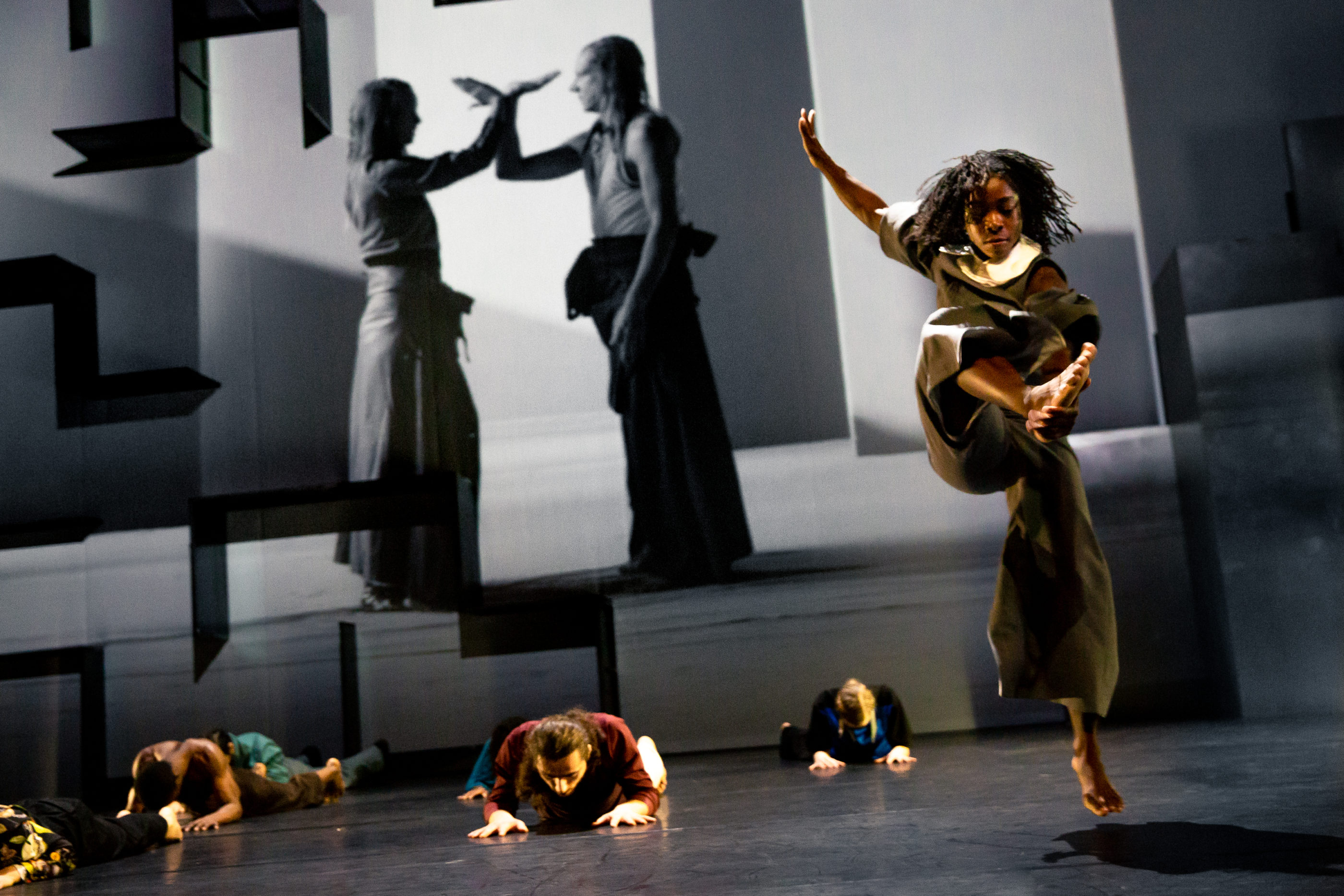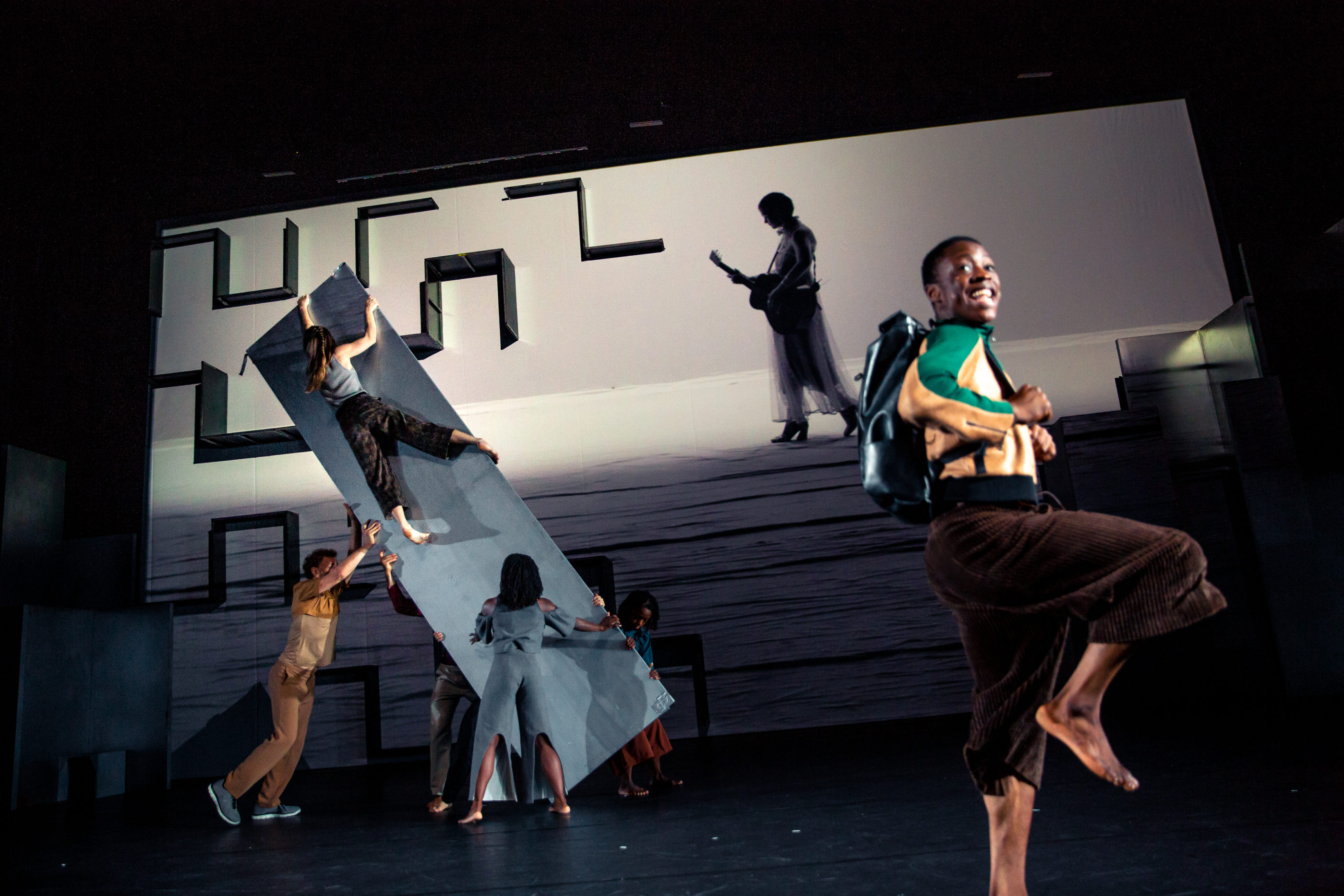 Die Tänzer und Tänzerinnen bewegen sich auf der Bühne wie in einer labyrinthischen Stadt. Den Bewegungen der Darsteller mit ihrer mitreißenden Energie antworten die Figuren auf der Leinwand, die ein betörendes Paralleluniversum erschaffen. Die Originalkomposition von Trixie Whitley und Phoenician Drive zieht uns vollständig in den Bann.